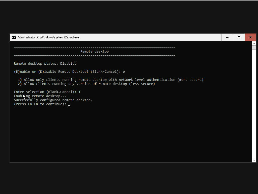 We will now enable remote desktop temporarily. Enter 7 and hit enter.